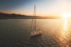 A solitary sailboat floats on Lake Guntersville as the sun sets