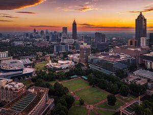 Centennial Olympic Park with the downtown skyline in Atlanta, Georgia at sun rise on a hot summer day